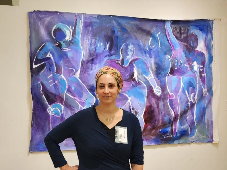 Rivka speaking at public opening night gathering, with her artwork behind her